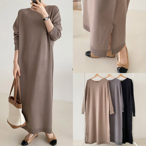 플러리싱 / 빅사이즈 베이직 라운드넥 니트 롱 원피스 플러리싱