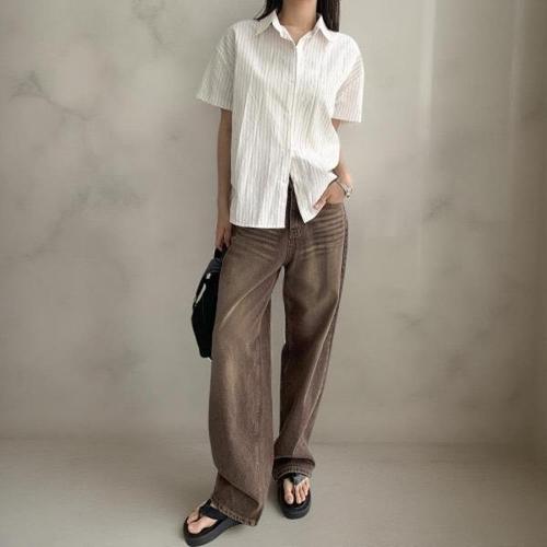 [다잇템]여자 줄무늬 빅사이즈 면원단 남방 반소매 남방