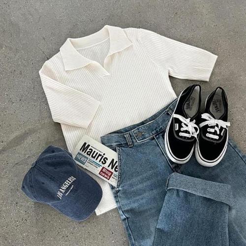 배색 오픈 카라 골지 니트 반팔 티셔츠 루즈핏 여성 빅사이즈