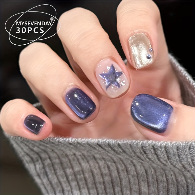 TEMU 30개입 숏 스퀘어 프레스온 네일, 다크 블루 스타 도트 대비 광택 인조네일, 여성용 심플 스타일, 일상/데이트/파티/휴일용 재사용 가능, 젤리 글루 & 네일 파일 포함