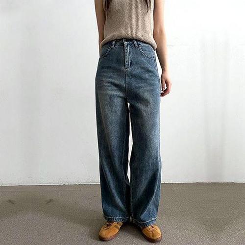 [옷자락] 여성 일상용 빈티지 워싱 코튼 와이드진