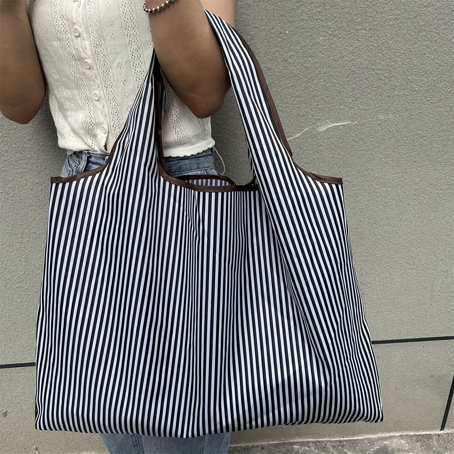 TEMU 대용량 접이식 토트 백 - 블랙 앤 화이트 수직 줄무늬, 가벼운 나일론, 닫힘 없음, 기계 세척 가능, 쇼핑 및 여행에 이상적, 여행용 토트 백 | 세련된 토트 백 | 내구성 있는 핸들 백, 토트 백|테무쇼핑|토트백