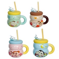 StarR 짱구 세라믹 호리병 머그컵 + 뚜껑 + 스트로우 4개입, 1개, 핑크+블루+그린+브라운