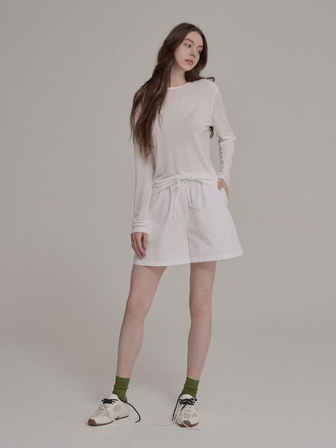 여성 단색 라운드넥 앞숄더 와이드 롱 슬리브 허리 조절 슬림 크롭탑 데일리 캐주얼 심플 만능 탑