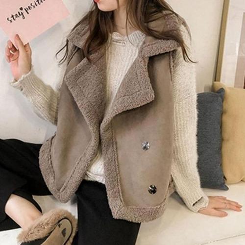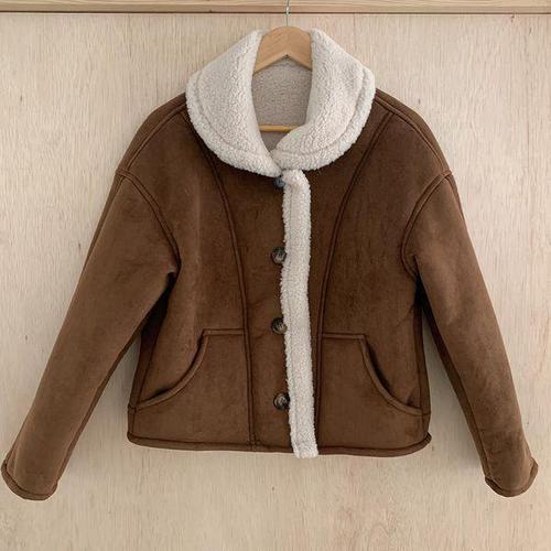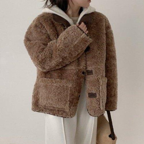 [옷자락]여자 뽀글이 양털카라넥 버튼 무스탕 절개 밤색 자켓