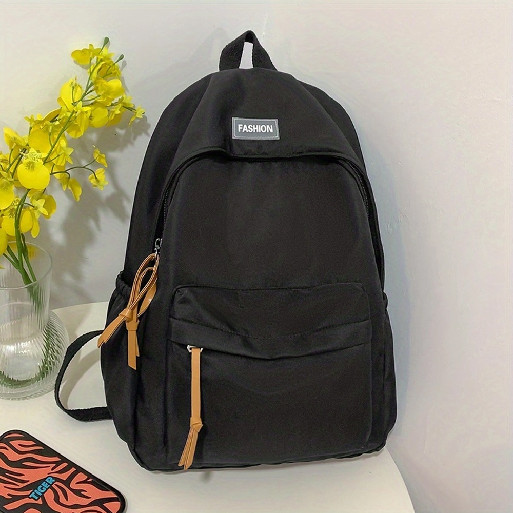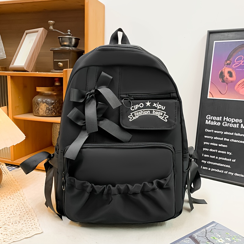 TEMU 우아한 리본이 달린 여성용 백팩 - 베이지/화이트/블랙, 지퍼 클로저, 내구성 있는 나일론 학교 가방, 대학, 직장, 일상 사용용 - 여성 및 청소년을 위한 귀여운 백팩, 학교용 백팩, 여성 디자인, 튼튼한 구조, 청소년 액세서리