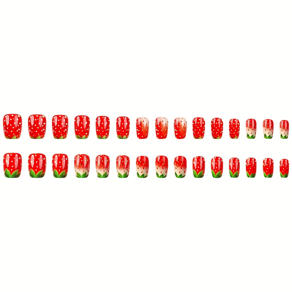 TEMU 24pcs 광택 프레스온 딸기 손톱 - 녹색 잎과 반짝이는 액센트가 있는 신선한 여름 과일 디자인, 여성용 재사용 가능한 인공 손톱, 짧은 발레 스타일, 광택 있는 마무리, 특별한 기회에 완벽한 파티 손톱 | 반짝이는 액센트 | 광택 있는 마무리 손톱, 딸기 손톱