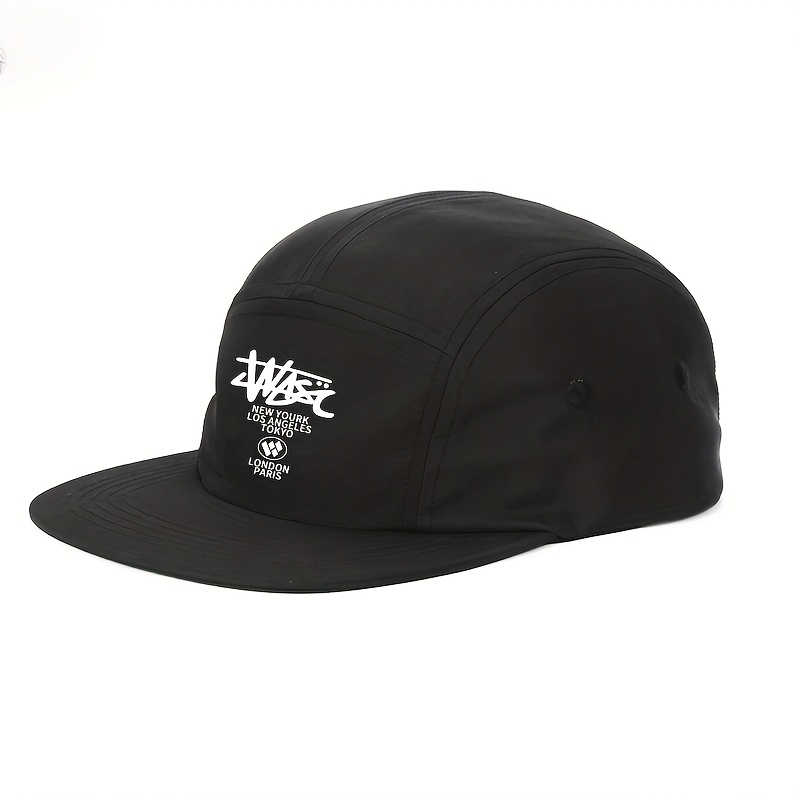 TEMU 고품질 클래식 5패널 야구 모자, 조절 가능한 소프트 탑과 통기성 디자인, 남녀공용 한국 스타일 모자, 흰색 글자가 있는 블랙, 폴리에스터 소재, 손세탁 가능, 캐주얼 헤드웨어 | 한국 스타일 캡 | 건설, 야구 모자