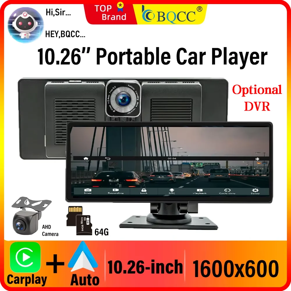 BQCC 휴대용 무선 카플레이 화면, HD 후방 후진 카메라, 자동차 라디오 DVR MP5 멀티미디어 비디오 플레이어, 안드로이드 오토, 10.26 인치