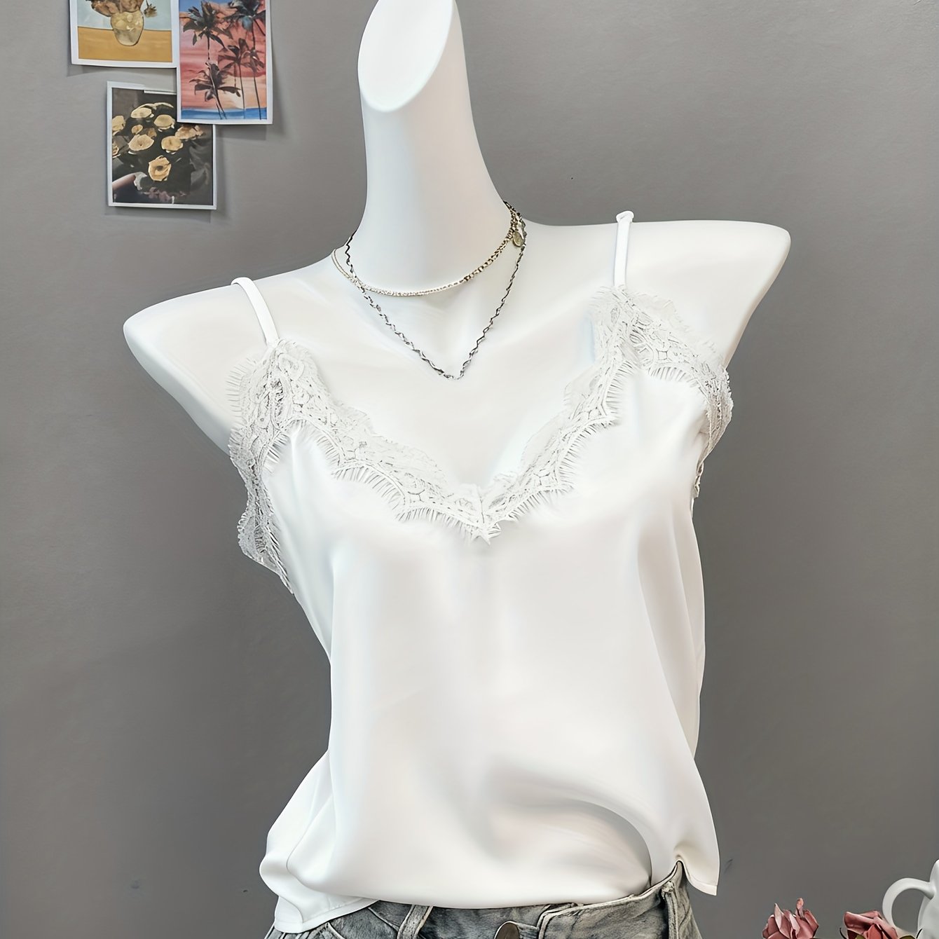 TEMU 플러스 사이즈 - 플러스 사이즈 꽃무늬 레이스 트림 캐미 탑 - 우아한 여성용 V넥 민소매 블라우스, 가벼운 논스트레치 원단, 봄/여름 캐주얼 웨어에 완벽, 여름 패션 탑 | V넥 캐미 탑 | 논스트레치 원단