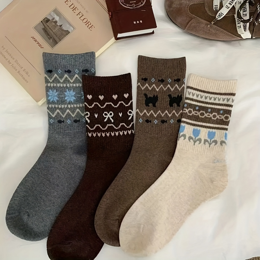 TEMU 여성용 미드 카프 양말 5켤레 세트. 블랙 레트로 엘레강스 기하학 패턴으로 트렌디하고 스타일리시합니다. 가볍고 속건성으로 봄, 가을에 적합하며, 흡습성 특성이 있습니다. 헬스장에 적합합니다.