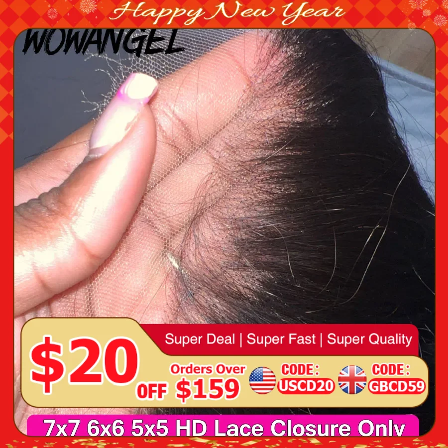 와우 엔젤 7x7 6x6 5x5 HD 레이스 클로저 정면 인모 스트레이트 헤어 멜트 스킨, 사전 발모 HD 레이스 클로저 버진 헤어