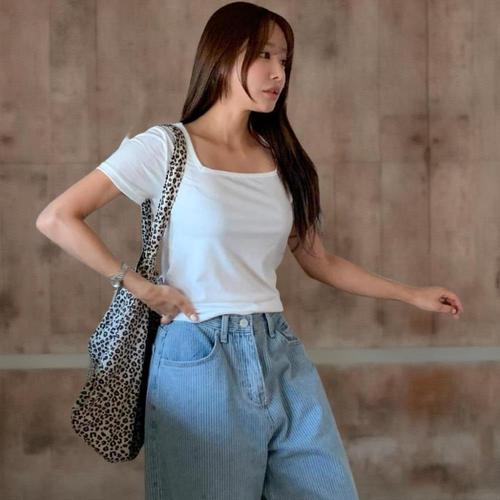 [미라클세븐]여성 슬림핏 스퀘어넥 반팔티셔츠 둥근밑단