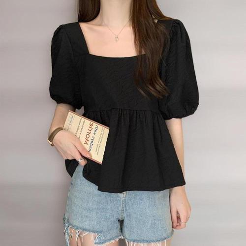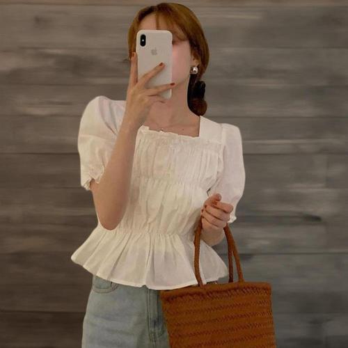 [미라클세븐]여성 퍼프 소매 숏 블라우스 스퀘어넥 셔링 디자인