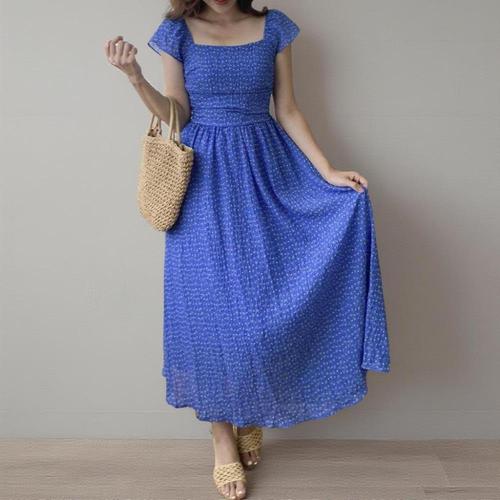 [미라클세븐]여성 플레어 롱드레스 꽃무늬 스퀘어넥 반팔