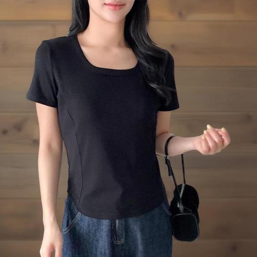 봄 여름 여성용 슬림핏 슬리밍 스퀘어넥 티셔츠
