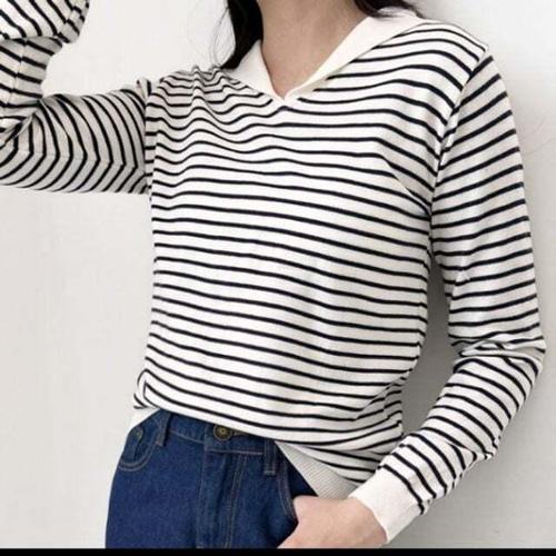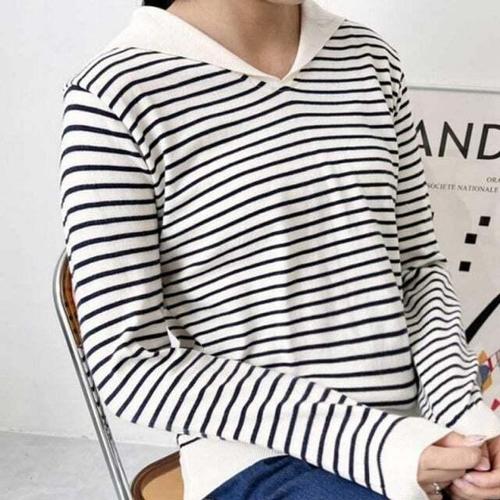 [셀럽하우스]스타일 WOUS8745 세일러 캐주얼 단가라 패턴 니트 긴팔 티셔츠