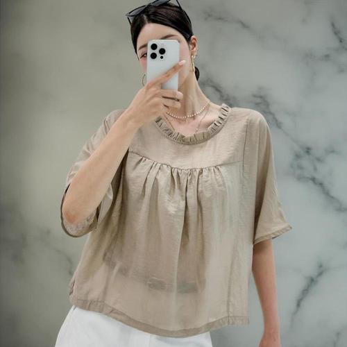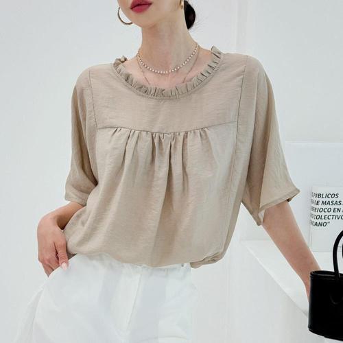 [옷자락]여성 시스루 라운드 버튼 셔링 블라우스 여름용