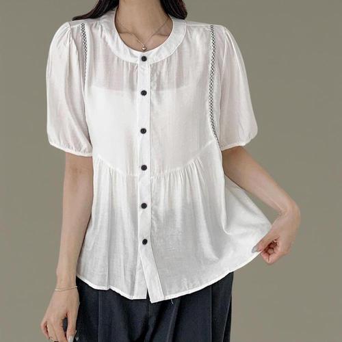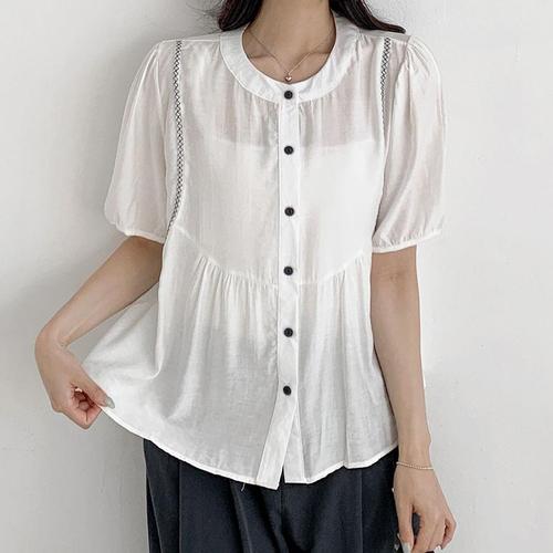 [옷자락] 여자 스티치 버튼 라운드 셔링 시스루 여름 블라우스