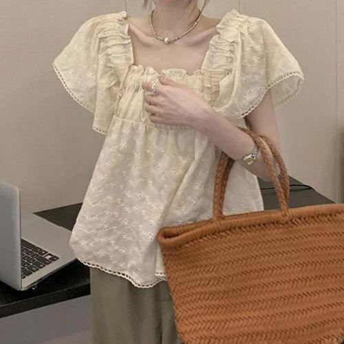 [옷자락]여성 프릴 라운드넥 셔링 시스루 끈 여름 블라우스