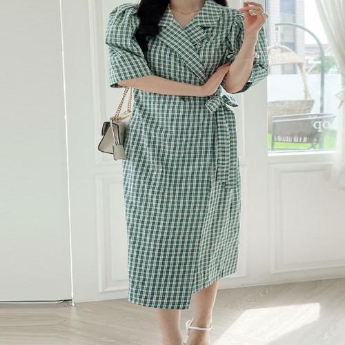 [다잇템]여자 여름 벨티드 랩 콩단추 반팔셔츠 롱원피스