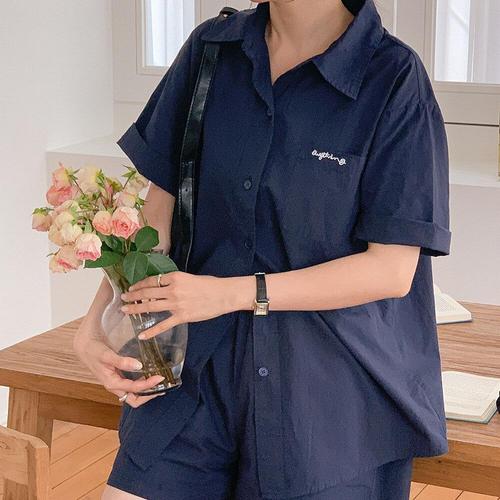[옷자락]여자 캠퍼스 장마룩 반팔 카라셔츠 밴딩 숏팬츠 세트