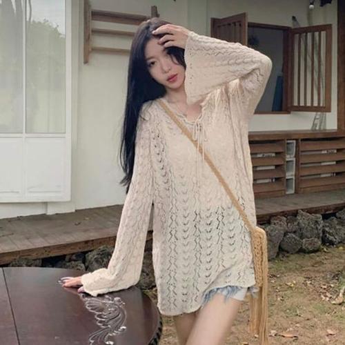 [에이치플러스몰]나팔 소매 캐주얼 여성 니트티 필수템 스트링 롱 니트