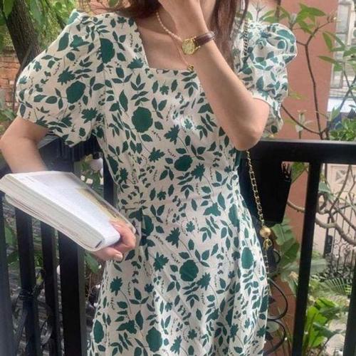 [에이치플러스몰]스퀘어넥 인기 나뭇잎 롱원피스 퍼프소매 감성 셔링