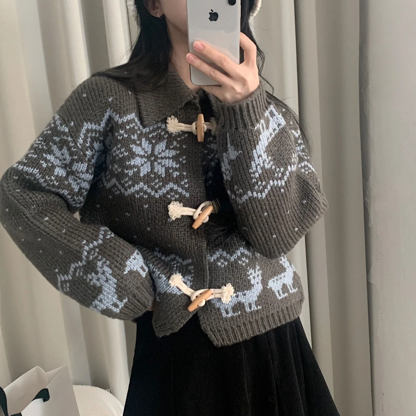 여성용 두꺼운 겨울 니트 스웨터 노르딕 스타일 따뜻한 커프스 버튼 눈송이 디자인 오픈 가디건 긴팔 상의