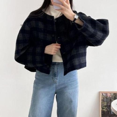[옷자락]여성 클래식 울 체크 라운드넥 투웨이 숏자켓