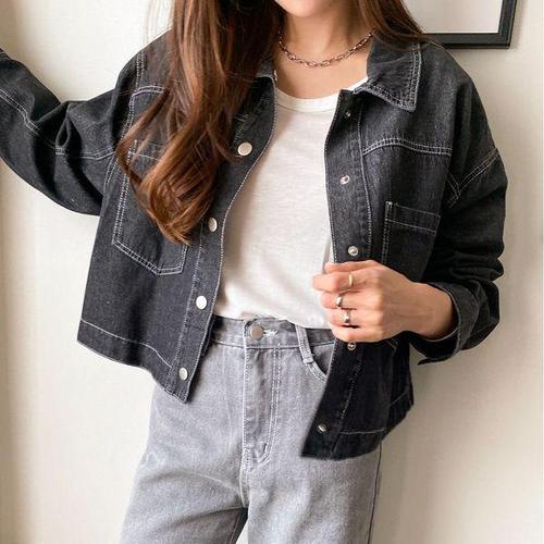 [에이치플러스몰]여성 크롭 데님자켓 숏 긴팔 청자켓 캐주얼 빈티지룩