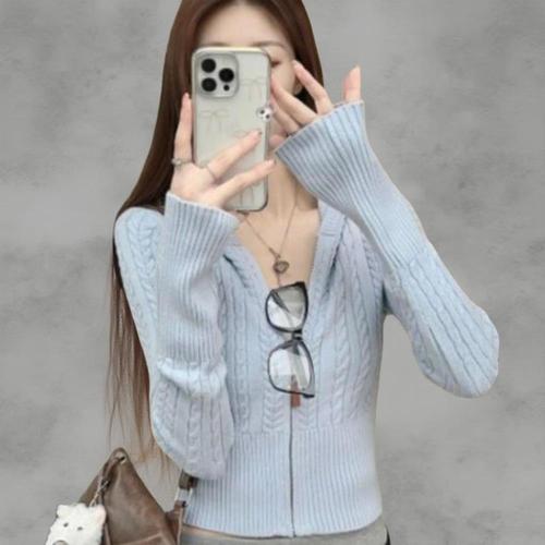 [옷자락] 여성 케이블 패턴 집업 후드 슬림핏 숏 니트