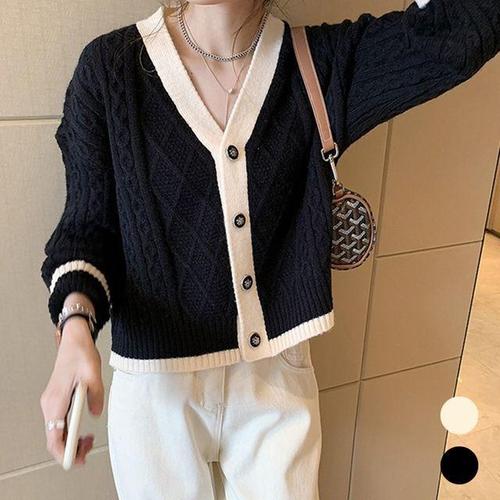 [모노무드]LMO 여자 숏기장 기장고급스러운 케이블니트 프리미엄 무늬 컬러믹스 니트집업