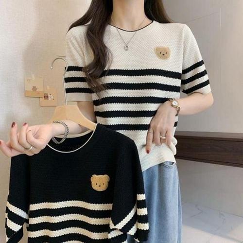 베이직삼색 줄무늬 원형넥 숏티 티 WFK218M