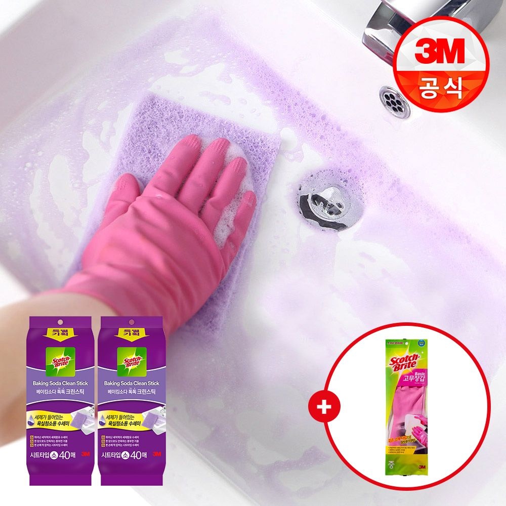 베이킹소다 시트타입 크린스틱 수세미 소형 40매x2개(총 80매) + 고무장갑 사은품