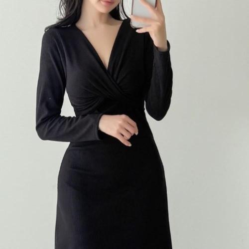 여자 봄 가을 겨울 무지 브이넥 골지 롱 원피스 모임룩 하객룩