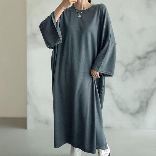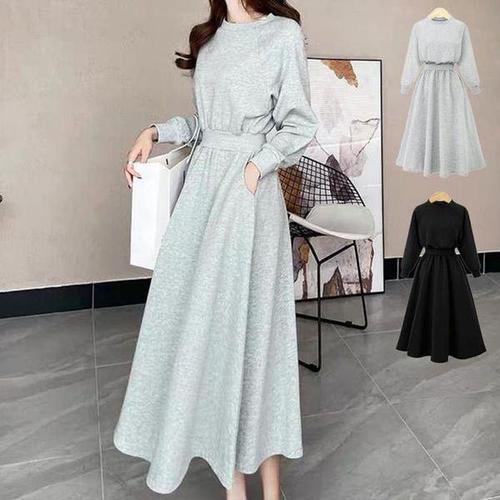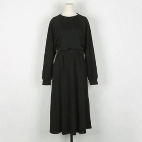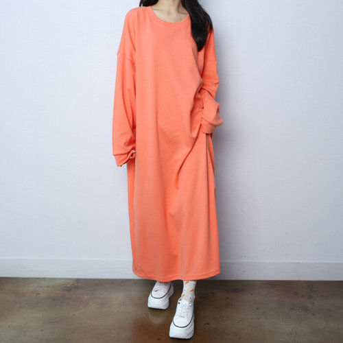 [옷자락]여성 캐주얼 무지 라운드넥 긴팔 롱 원피스
