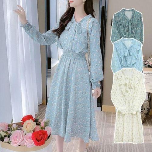 패턴 원피스 플라워 프릴 긴팔 쉬폰 봄가을 롱스커트 WEE8EA0