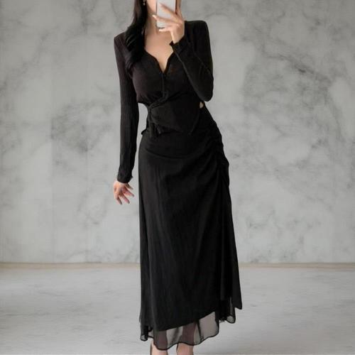 [옷자락]여성 사랑스러운 쉬폰 배색 뒷밴딩 셔링 롱 스커트