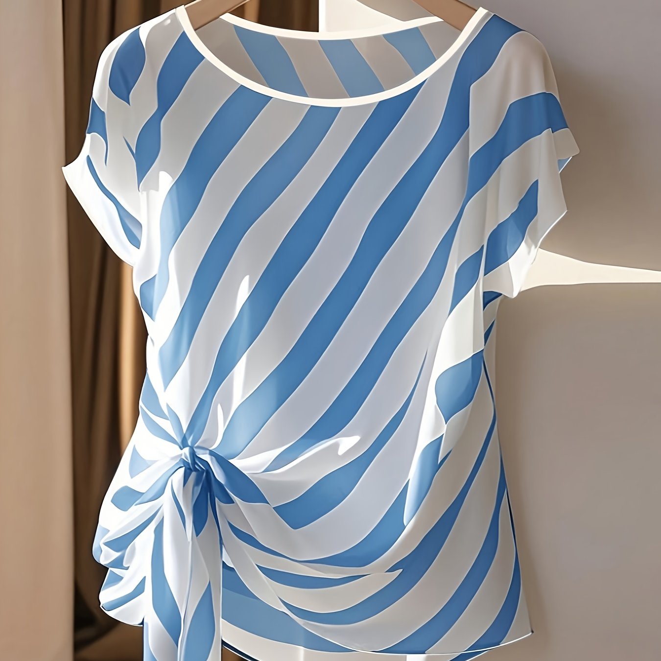 TEMU 그레이트 프랑스 허리 슬리브리스 블루 블라우스 - 크루 넥, 단색, 가벼운 폴리에스테르, 여름 여성 패션 상의, 프릴 헴 및 벨트 디테일, 여성용 블라우스