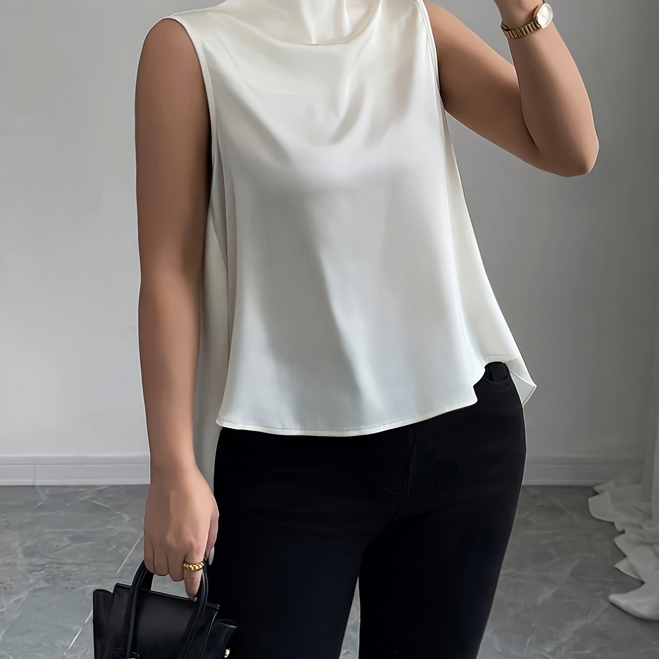 TEMU 여성의 우아한 슬리브리스 사탕 블라우스 - 시크 스탠드 칼라, 단색, 긴 밑단, 봄/여름 캐주얼 웨어용 일반 핏, 캐주얼 웨어 블라우스 | 우아한 슬리브리스 탑 | 사탕 원단