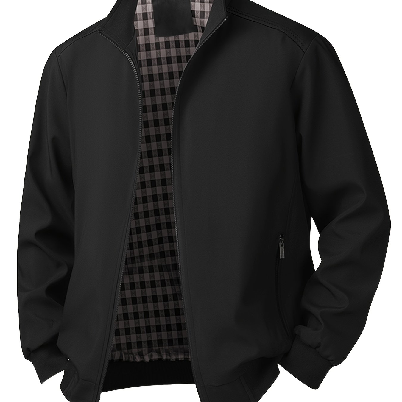 TEMU 남성 플러스 사이즈 해군 파란색 스포츠 재킷 - 캐주얼 지퍼업 스탠드 칼라, 긴 소매, 포켓, 봄/가을, 봄 재킷, 스포티한 룩, 폴리에스터 안감, 플러스 사이즈