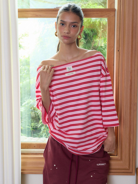 [아우어솔티] 스너기 스트라이프 루즈 핏 티셔츠 / 체리