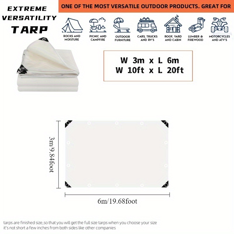 TEMU 흰색 방수 헤비 듀티 타포린 커버, 다양한 대형 사이즈로 제공되는 다용도 야외 보호 타프 - 두꺼운, 방수, 찢김 방지, 금속 강화 아일렛 포함, 농장, 캠핑, 야외 사용, 마당, 가구, 보트에 적합