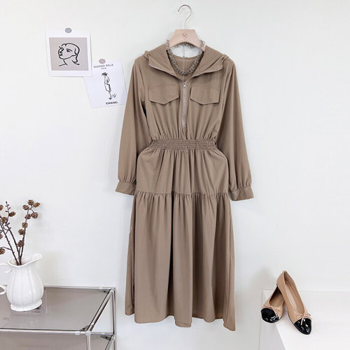 미즈큐즈 / 허리 스모크 밴딩 반집업 투포켓 후드 셔링 롱 원피스
