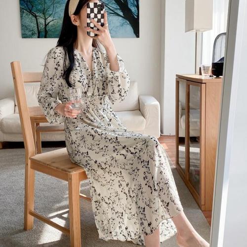 샵앤) 봄신상 여성 라운드넥 스모크 잔꽃 간절기 블라우스 롱 원피스 TH-U-WDR-20273-아이보리