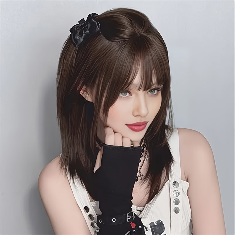 TEMU 20인치 일반 가발, 어깨 길이의 블랙-브라운 헤어, 앞머리와 하이 레이어 울프 테일 스타일 특징, 여성 데일리 파티에 적합, 내열성 합성 섬유 재질