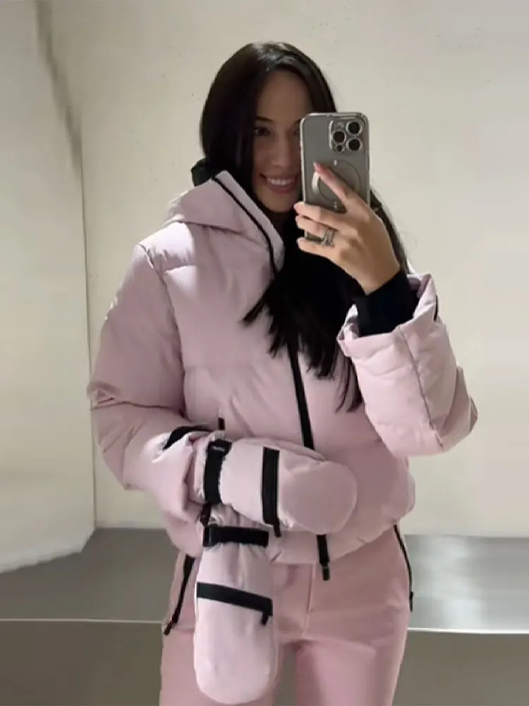 두꺼운 따뜻한 여성용 스키웨어 핑크 하이 칼라 후드 코튼 패딩 코트 스트레이트 레그 지퍼 팬츠 2025 신상 겨울 여성 스키복