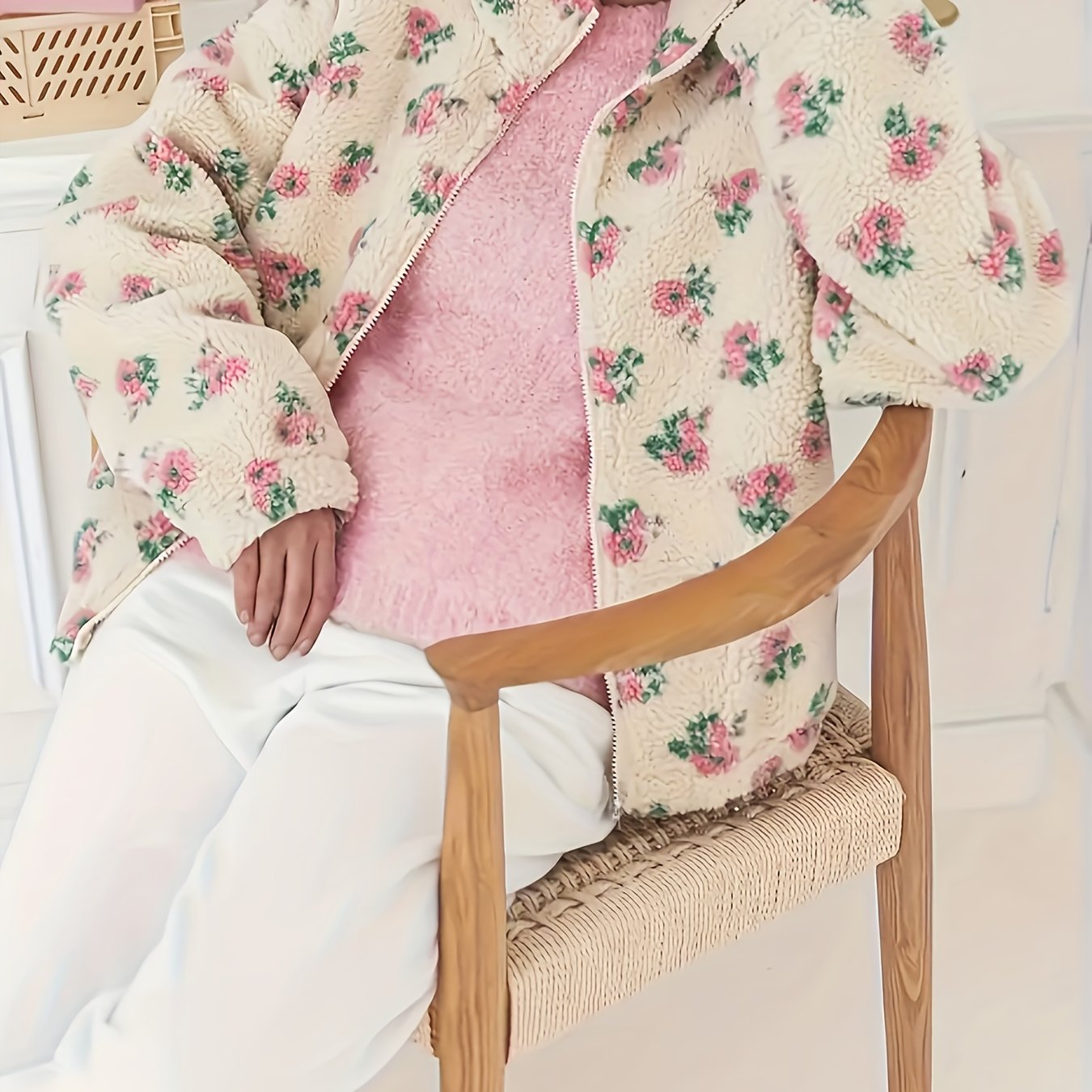 TEMU 우아한 겨울 플로럴 프린트 A라인 재킷 - 풀지퍼 프론트 & 스탠드 칼라, 부드러운 미들 탄성 소재, 겨울용 아우터코트, 캐주얼 아웃웨어 (세탁기 사용 가능) - 데일리 웨어 & 스마트 캐주얼 행사용 포근한 재킷