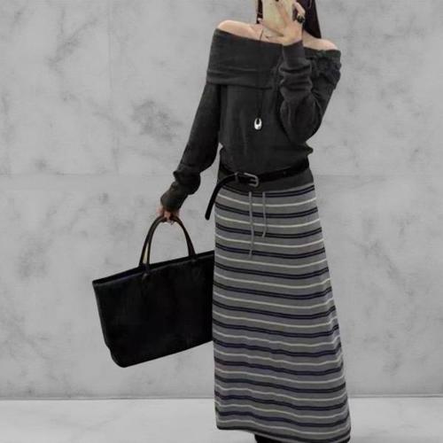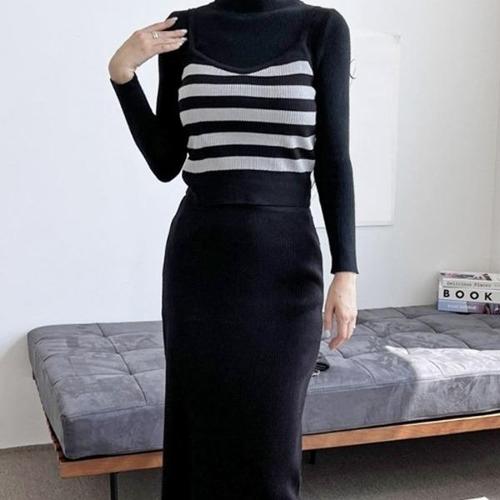 여성 초가을 스타일 니트 조끼와 스트라이프 셔츠 슬림핏 하프 스커트 대학 패션 세트 폴리에스터 코튼